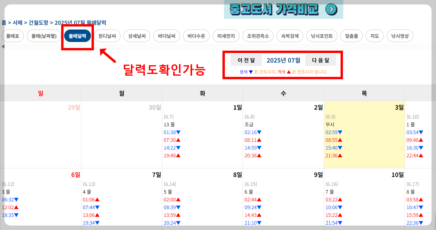 ✔️ 7월 한 달치 만조·간조 시간이 달력 형태로 표시