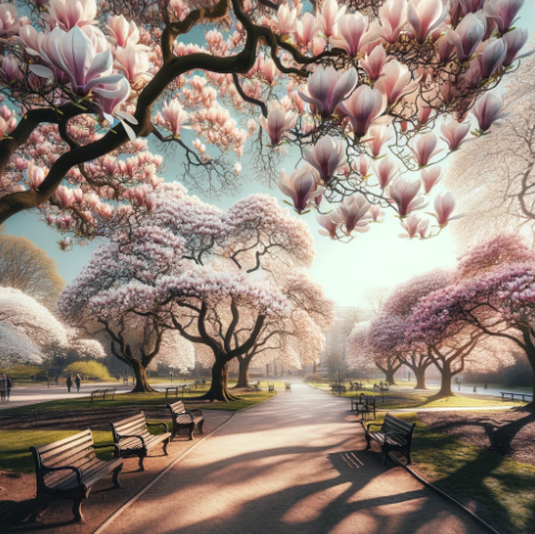 목련 3월 중순 ~ 4월 크고 화려한 흰/보라 꽃잎, 아파트 단지에서 자주 보임
