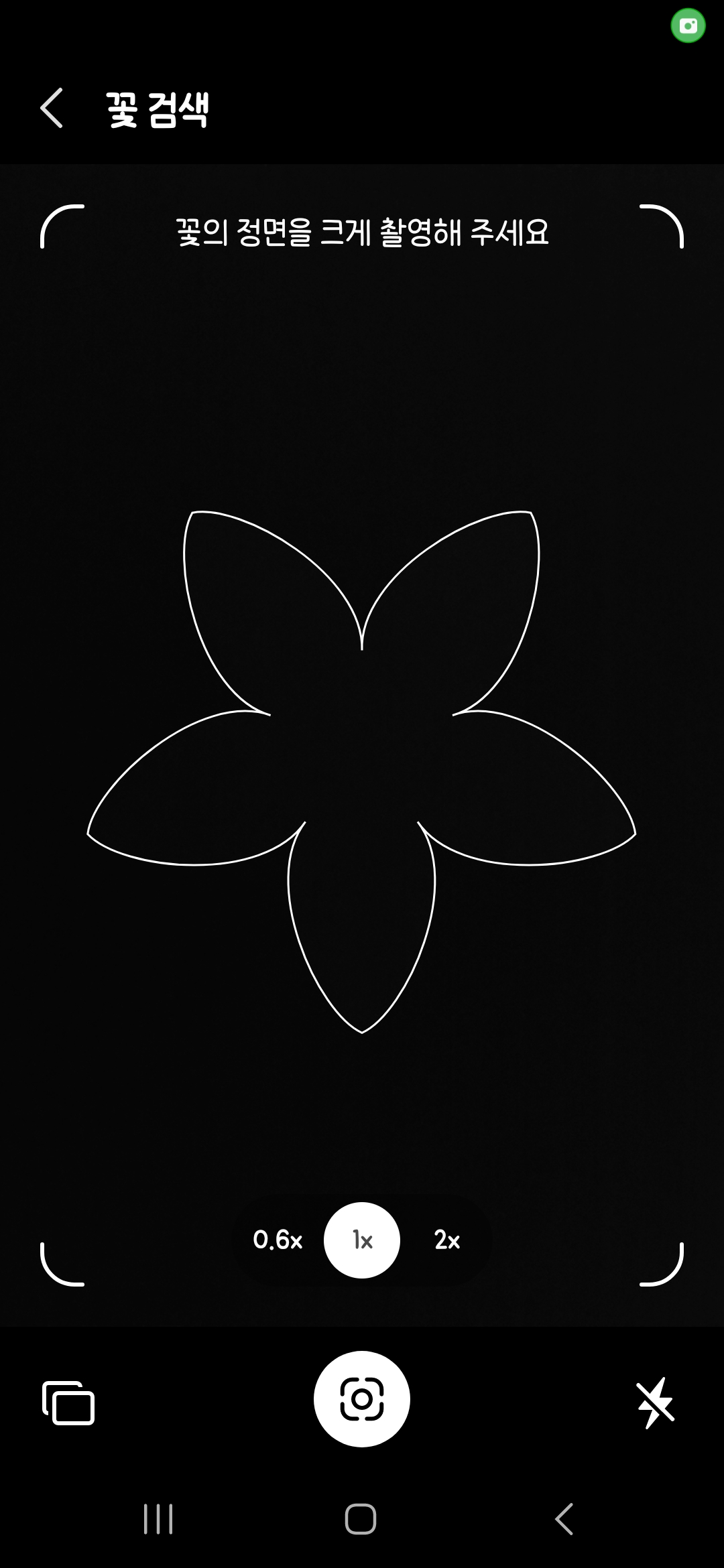 '꽃 검색' 아이콘을 선택하면, 카메라가 실행되며 꽃의 윤곽선이 표시된 프레임이 나옵니다. 이때, 꽃의 중심을 화면 한가운데에 오도록 조정하고 사진을 찍어주세요.