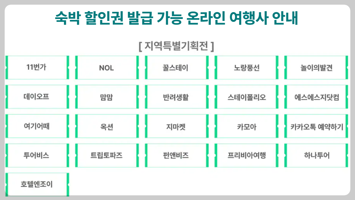 먼저 야놀자, 여기어때, 쿠팡, 11번가, 하나투어 등 숙박세일페스타 참여 OTA 중 하나를 선택하세요.