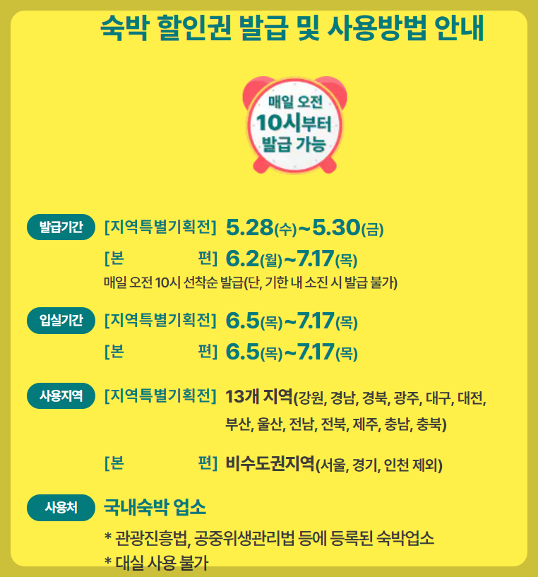 올 여름, 숙박세일페스타 6월 할인쿠폰✅으로 더 알뜰하고 즐거운 여행 떠나보세요! 😊✨ 5만원 숙박 할인쿠폰은 딱 3일만 선착순으로 받을 수 있으니 당장 서둘러주세요!