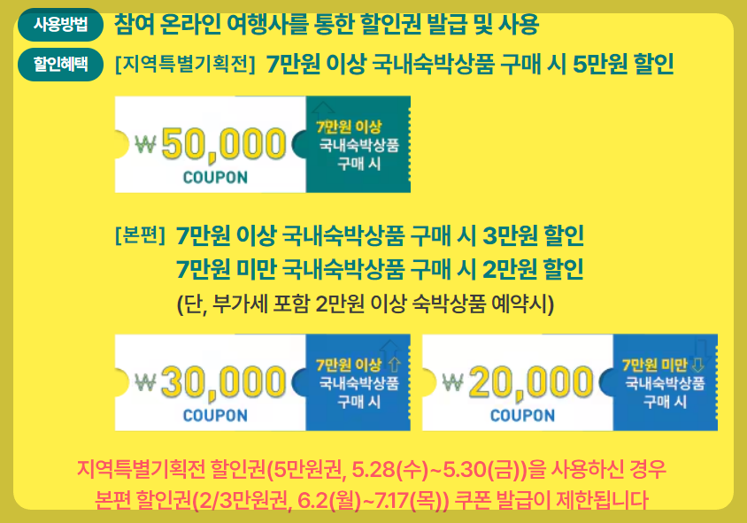 올 여름, 숙박세일페스타 6월 할인쿠폰✅으로 더 알뜰하고 즐거운 여행 떠나보세요! 😊✨ 5만원 숙박 할인쿠폰은 딱 3일만 선착순으로 받을 수 있으니 당장 서둘러주세요!