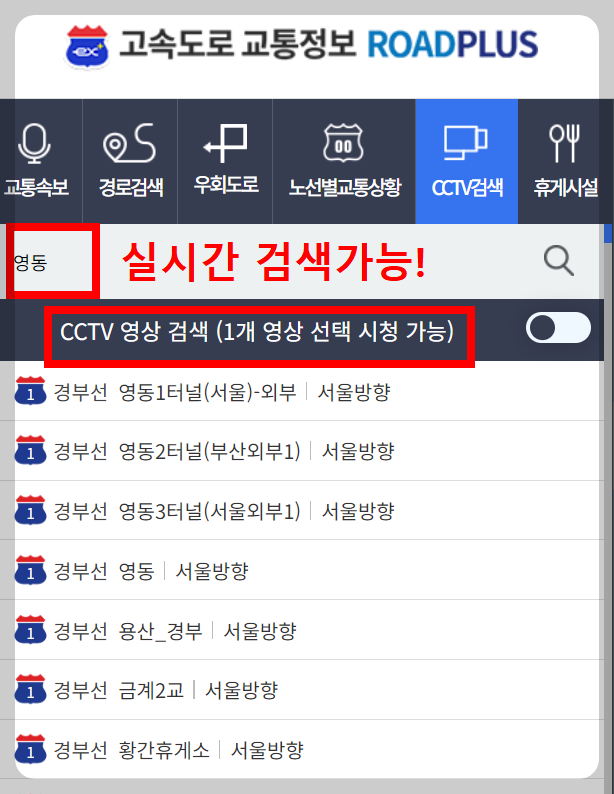 - 검색창에 원하는 지역 또는 고속도로 이름 입력해주세요. (예: 영동, 경부선)
