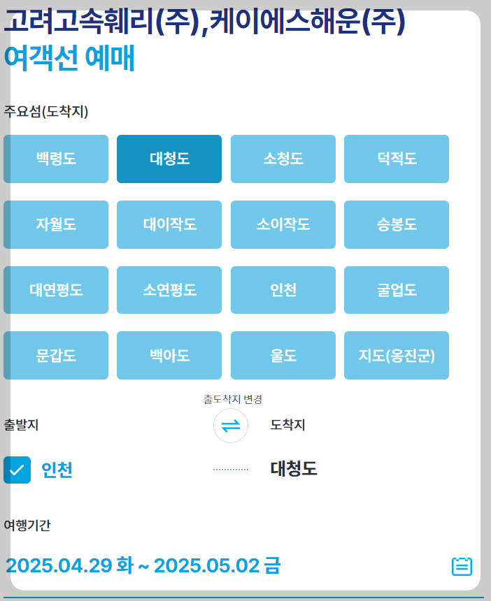 3. 출발지: ‘인천’ / 도착지: 원하는 섬을 조회하시면 됩니다.