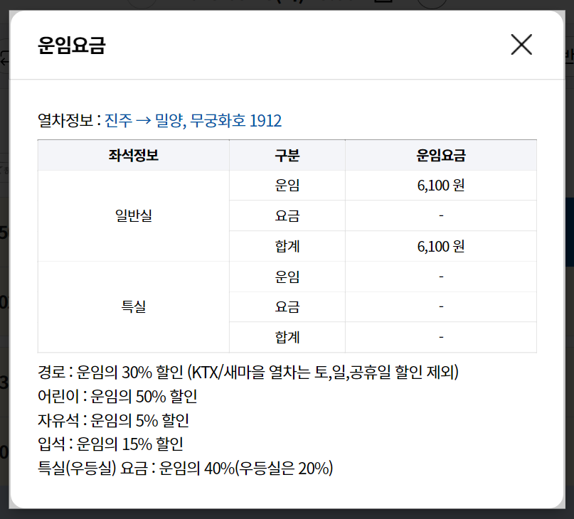 • 특실(우등실): 운임의 40%(우등실은 20%) 추가