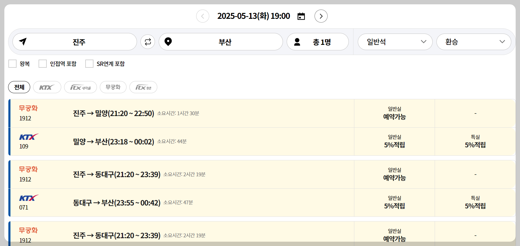실제로 2025년 5월 기준 진주에서 부산으로 가는 열차의 경우, KTX 단독 노선은 없고 ‘진주→밀양(무궁화호)’ 후 ‘밀양→부산(KTX)’ 방식으로 환승을 해야 하며, 시간대별로 배차 간격이나 좌석 현황이 다릅니다.