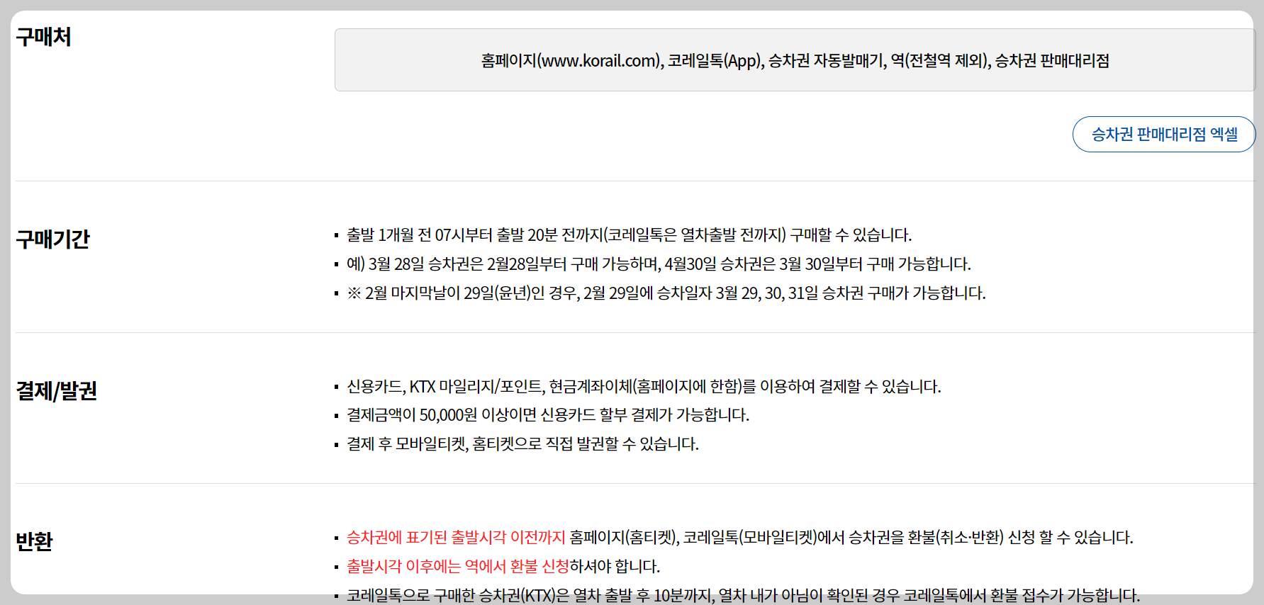 • 결제 수단: KTX 마일리지, 계좌이체, 포인트 등