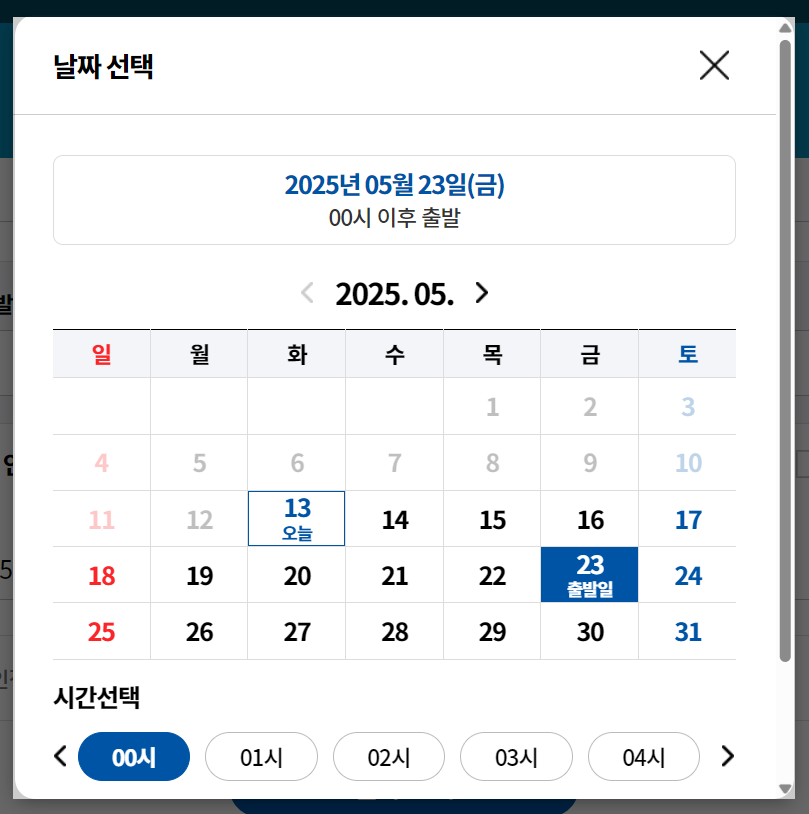 4. 출발 날짜 및 시간을 캘린더에서 선택