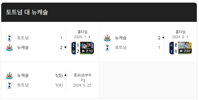 | 2025.01.04 | 토트넘 1 : 2 뉴캐슬 | 정규리그 경기 |